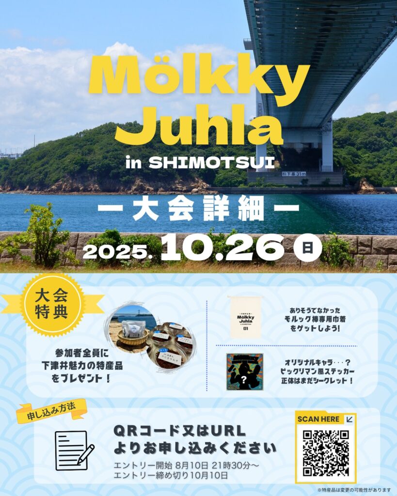 この大会名には、モルックを通じて下津井が「お祭り」のような賑わいに包まれ、多くの方にこの町の魅力を知ってもらいたいという願いが込められています。円福寺モルッククラブが主催する今回の大会は、地域の活性化と交流の場としても期待されています。